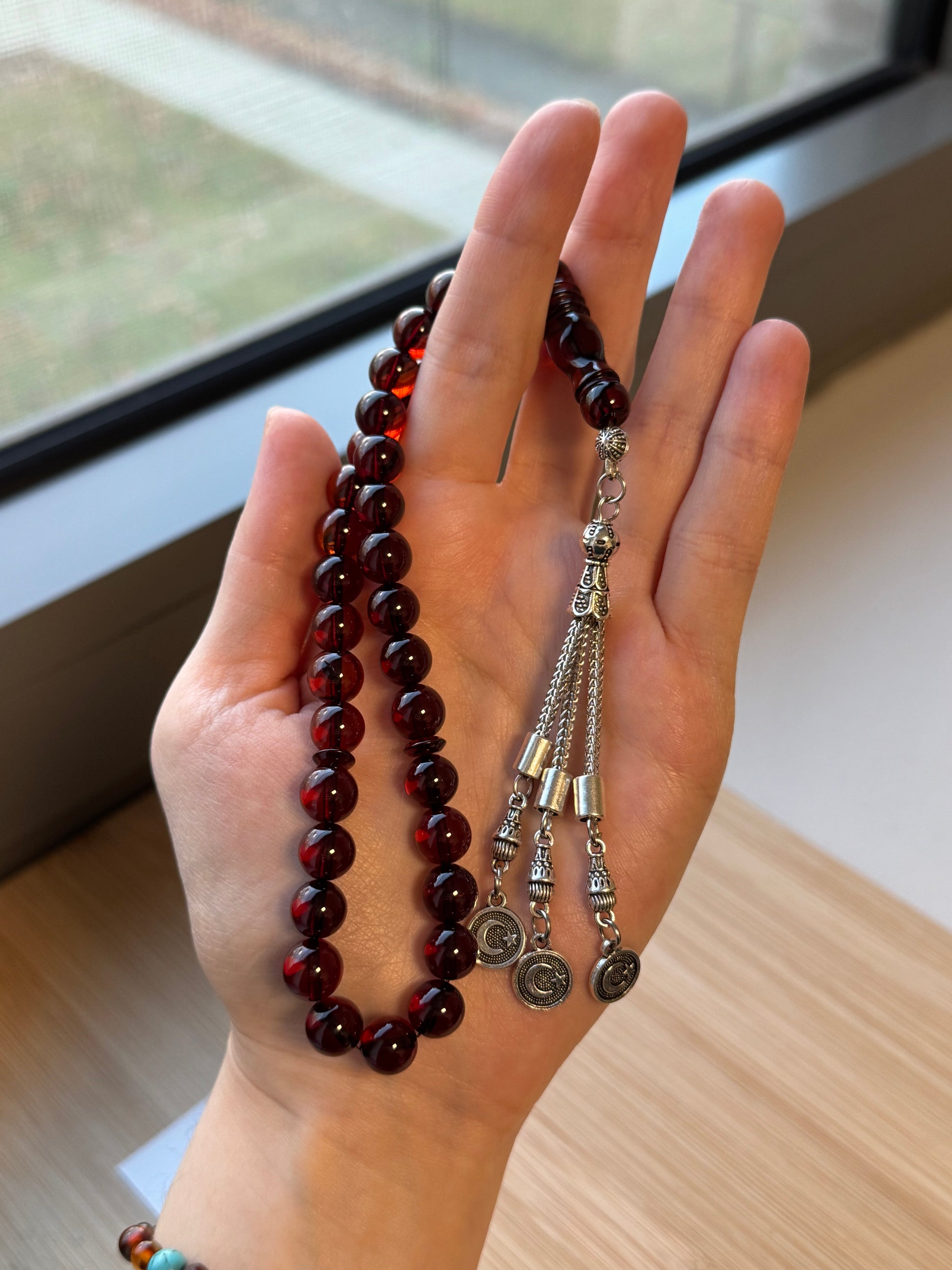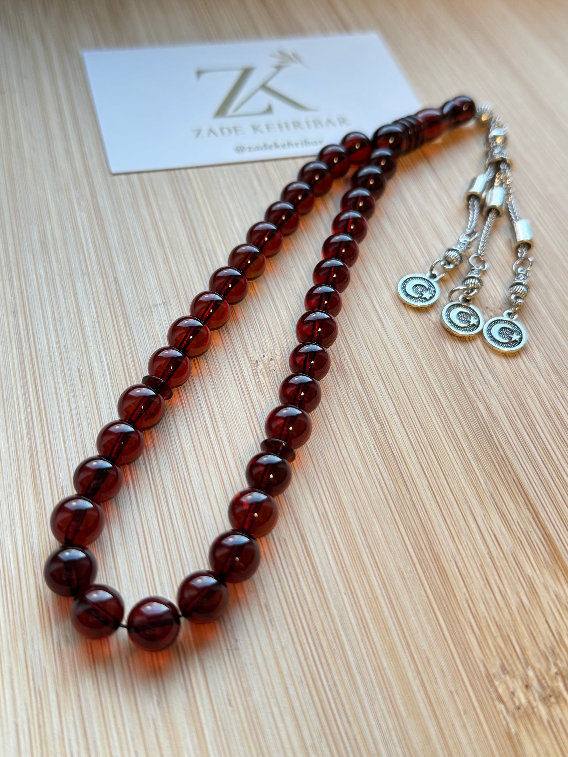 Kaliningrad Damla Kehribar Tesbih. Platin kaplama metal Püskül. Küre Kesim. Koyu Kahverengi. 9mm.